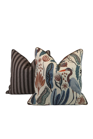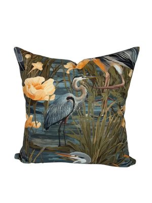 Everglades Heron in Plants Blue & Brown Fabric in a Decorative Pillow or Bolster